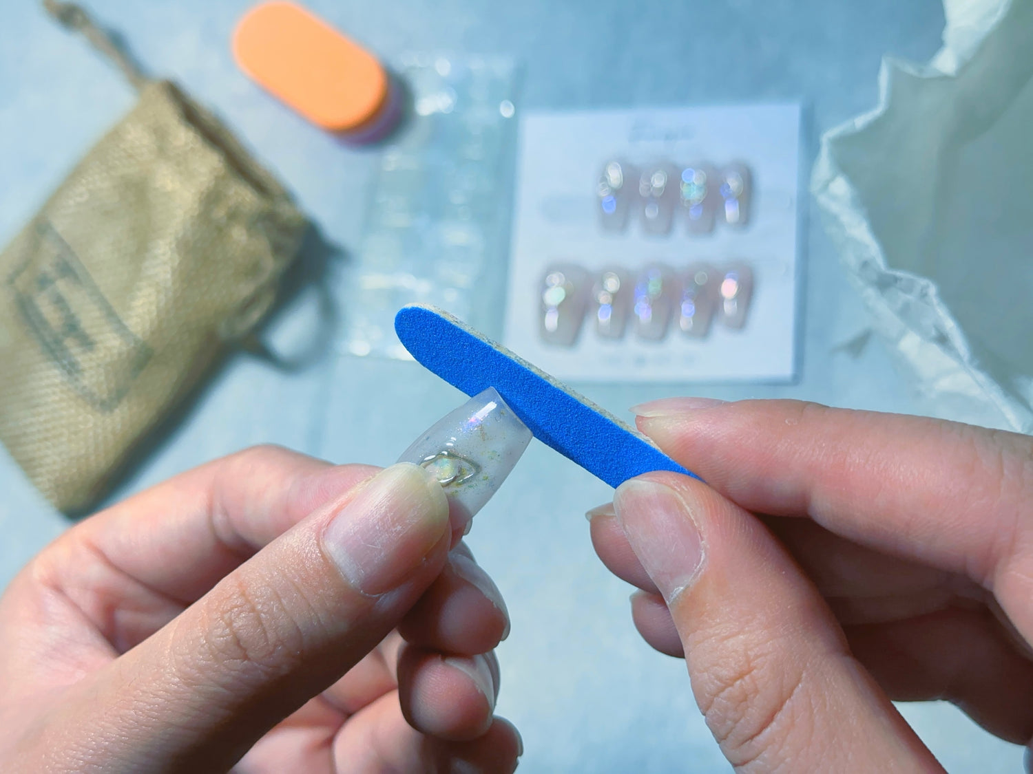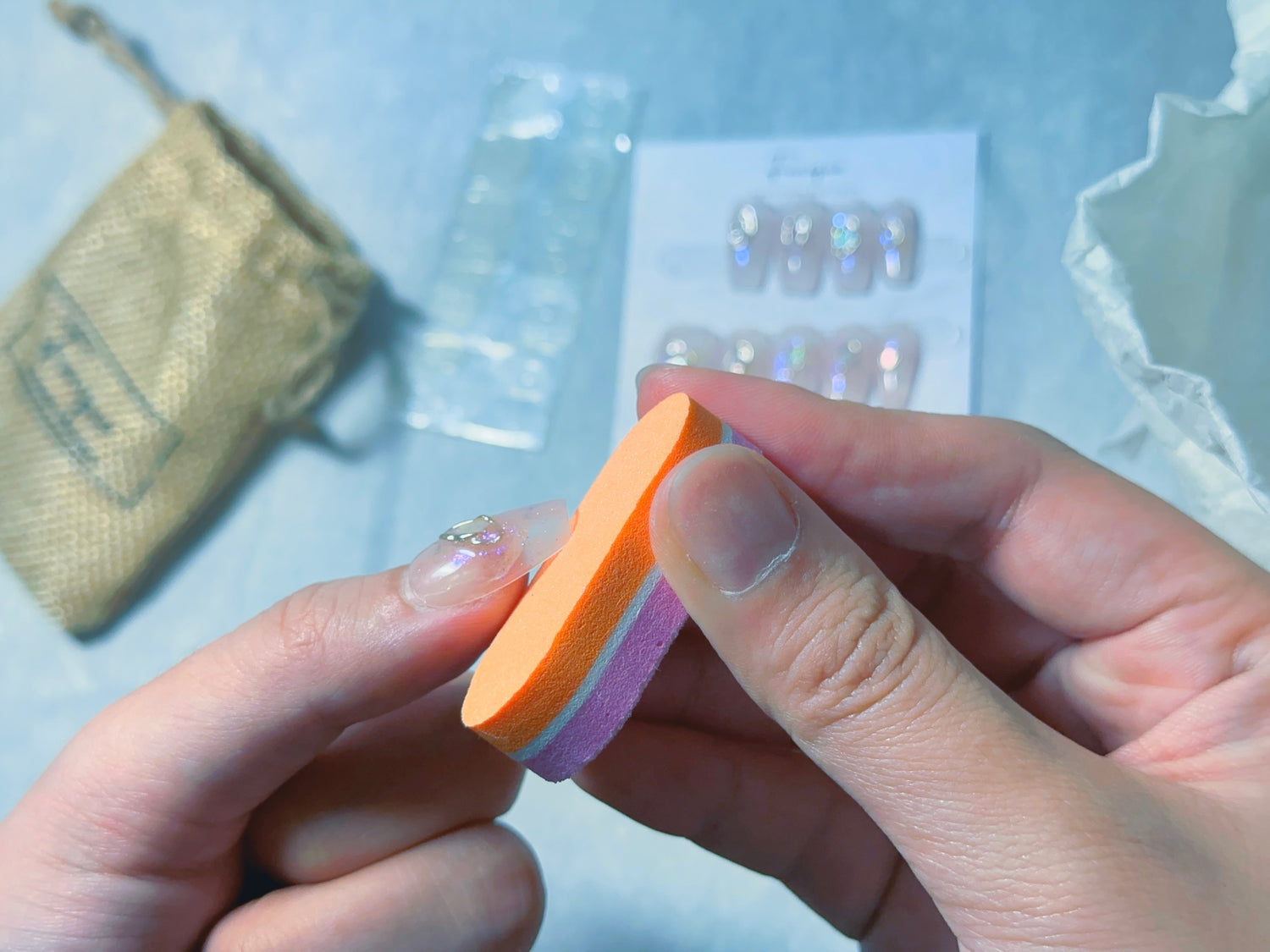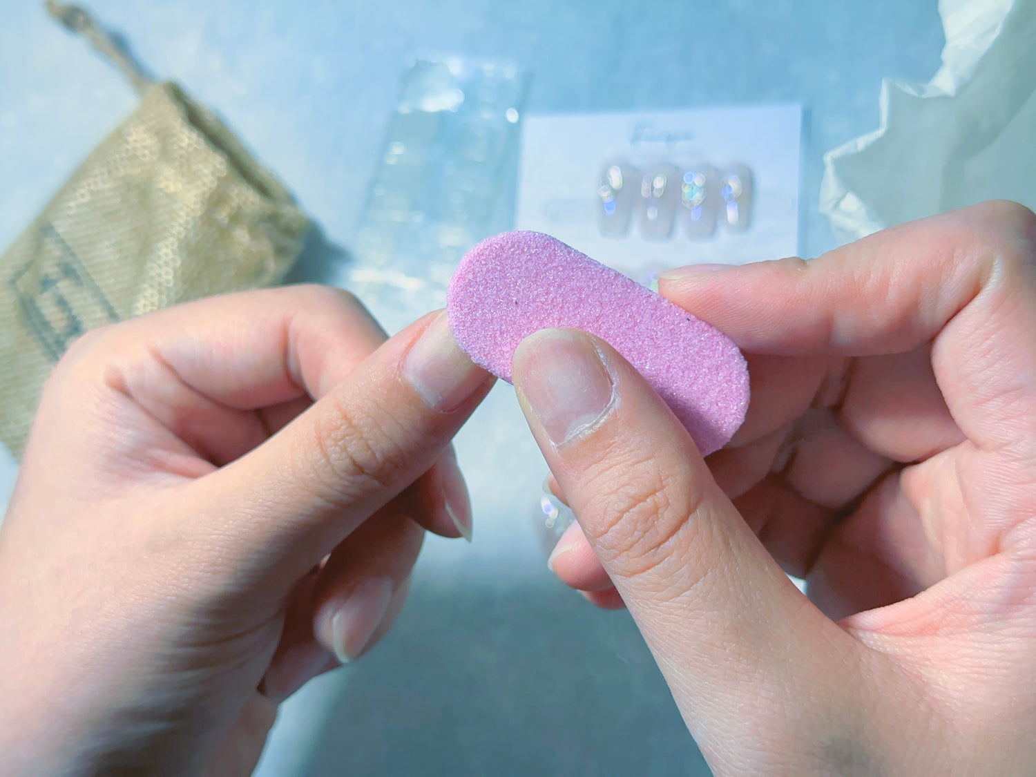 手指全体と爪を石鹸で洗浄し、付属のアルコールパッドで手や指先の油分・水分を拭き取ります。手が清潔な状態になったら、付属のネイルファイルで爪の長さと形を整えます。お好みのネイルチップのサイズに合わせて調整してください。