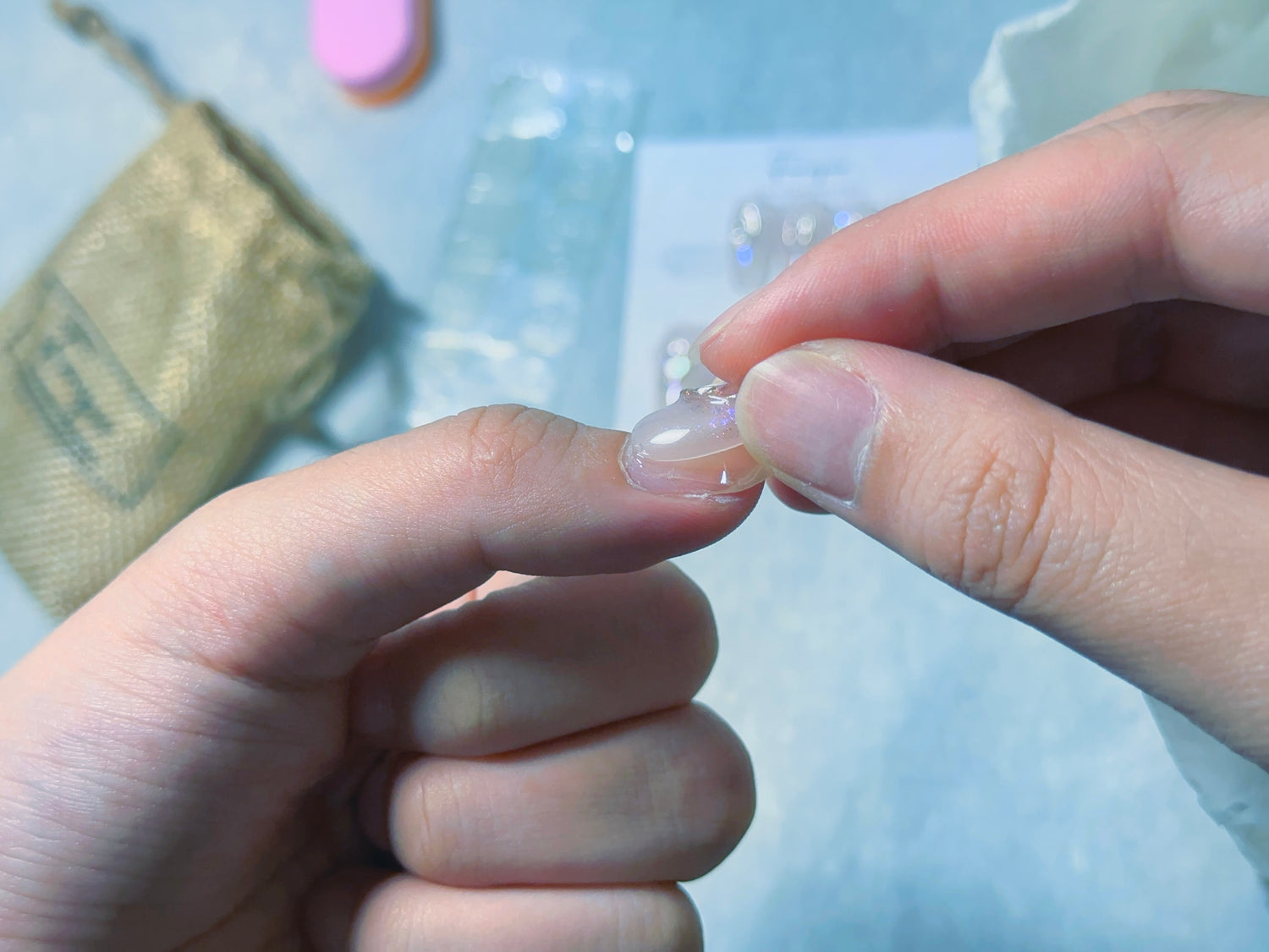 グミ装着前に爪の表面をネイルファイルで削ると持続力が向上します。爪の大きさに合った1DAYグミを選び、貼り付けます。この際、空気が入らないように注意しましょう。